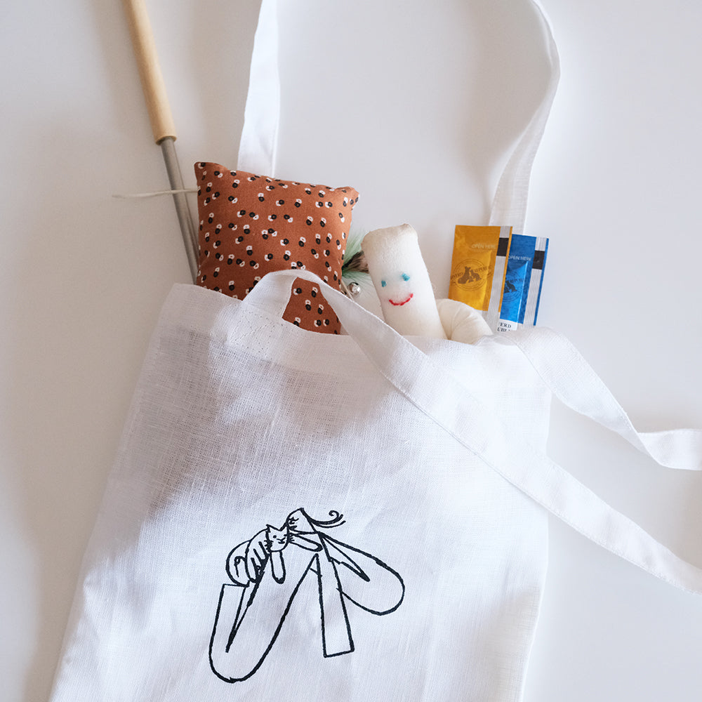 イラストのプリントは爽やかでかわいい印象のブルーグレーに、どんな服にも合わせやすいブラックの2色。バッグの生地はもともと「OVO Things」が展開していたテーブルクロスやベッドリネンに使われていた、きめ細やかで上質なヨーロッパリネン100%。そのままでも美しいのであえて無地の「だれのもの?」バッグも作ってみました。