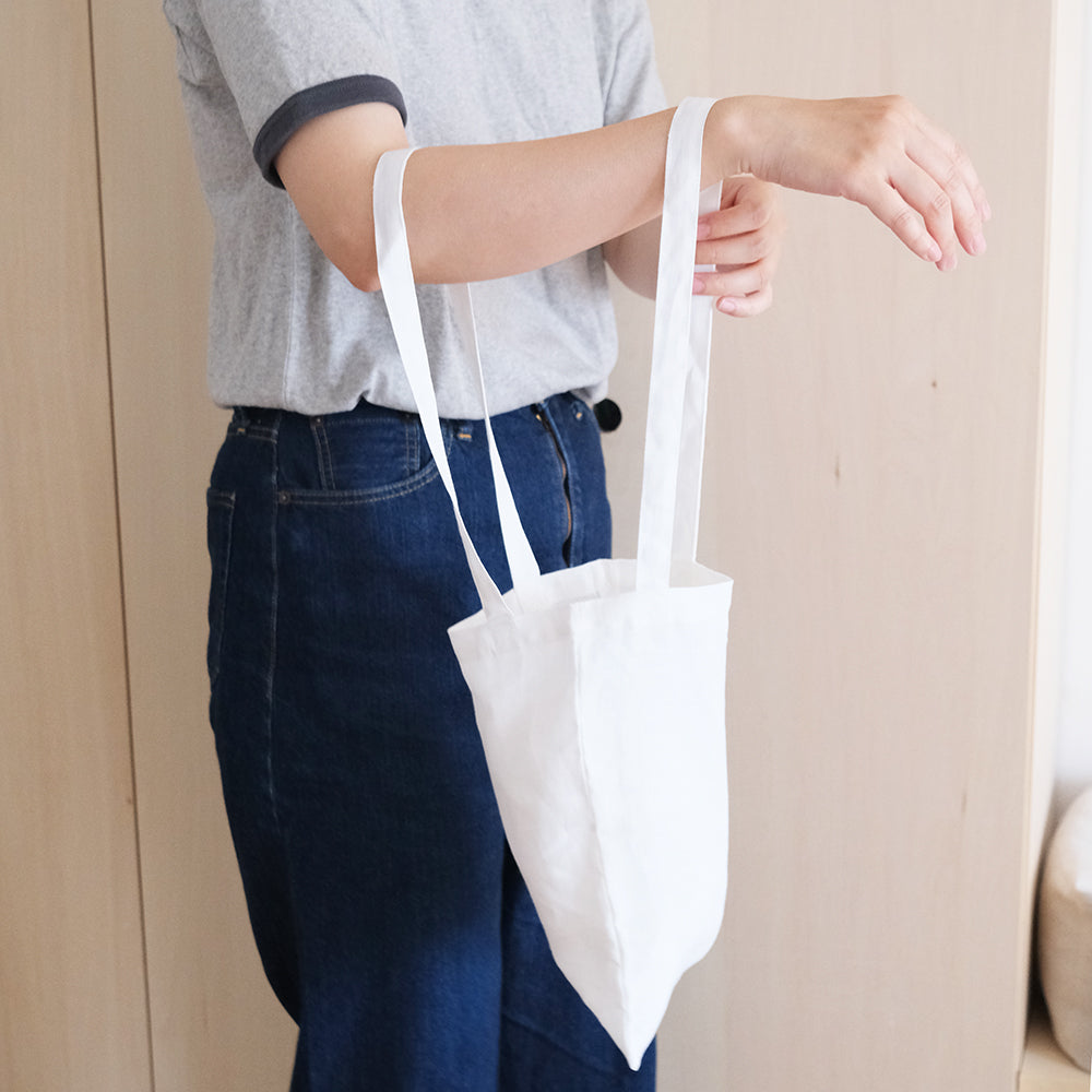 シンプルなトートバッグですが、大きさにこだわり、あえて小さめの作りに長めの取っ手をつけて、ちょっとしたお出かけやお散歩にはもちろん、サブバッグとしても使いやすいサイズ感に仕上げました。縫製・印刷(シルクスクリーンプリント)はすべて国内で行なっています。