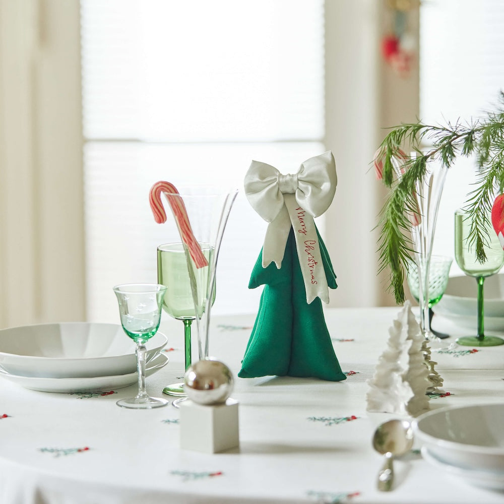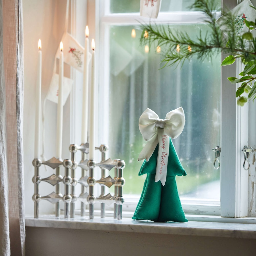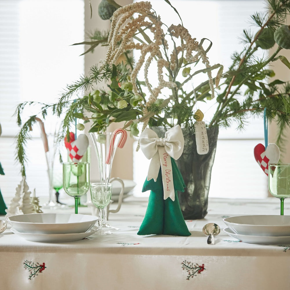 こちらはそんな 「blåmst.」から届いた、サテンリボンと「Merry Christmas」の刺繍が施されたパッド入りのクリスマスツリー。